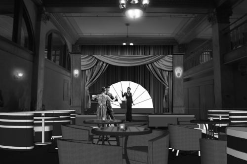 This is a screengrab from the Sketchup model. The entire town and all its details was modelled in Sketchup and the construction crew used the model to build the set- it saved the art department the time of having to create construction drawings (which is the the usual process).