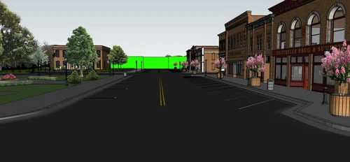 Another screengrab from the model. This was provided to the Vis-fx crew to indicate where set extensions might be required. vis-fx extensions were considered to make the town seem bigger than it was.